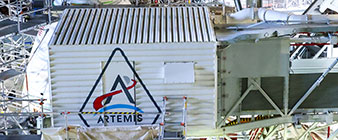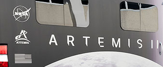 : The "white room" that the next moon-bound astronauts will use to enter their spacecraft on the launch pad has been painted to display the Artemis program logo. NASA techs, working high above the ground inside Kennedy Space Center's Vehicle Assembly Building, applied the red, blue and silver emblem to one of the environmental enclosure's exterior walls. The logo will be visible to spectators who watch Artemis SLS launches.