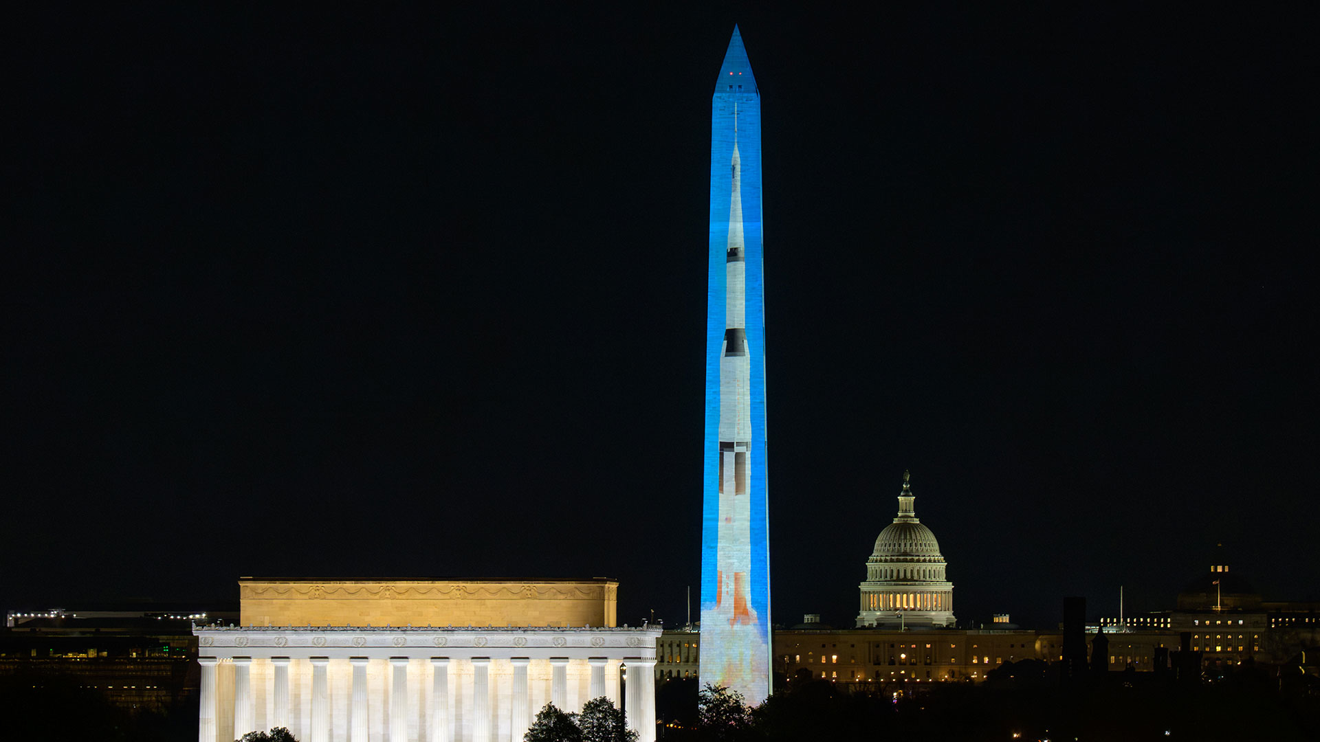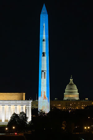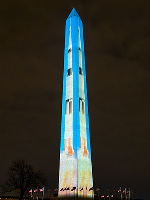 "Illumination of America" marked the second projection of a Saturn V rocket onto the Washington Monument since 2910 and first time that imagery has been mapped on all four sides. (NASA/Bill Ingalls)