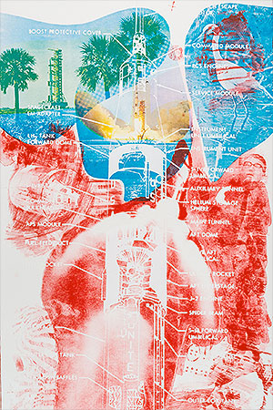 The exhibition includes the lithograph and screenprint "Sky Garden," a 1969 piece by Rauschenberg that features the Apollo 7 Saturn IB rocket in the form of a labeled blueprint that is overlayed with other NASA scenes, and "White Walk," a 1970 lithograph incorporating a photo of Gemini IV astronaut Ed White on the first American spacewalk five years earlier.