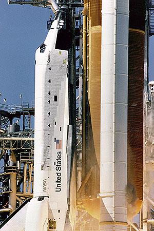 Close-up view of the liftoff of the space shuttle Challenger on its ill-fated last mission STS-51L. A cloud of grey-brown smoke can be seen on the right side of the solid rocket booster on a line directly across from the letter "U" in United States. This was the first visible sign that an SRB joint breach may have occurred, leading to the external tank (ET-26) being compromised during its ascent. (NASA)