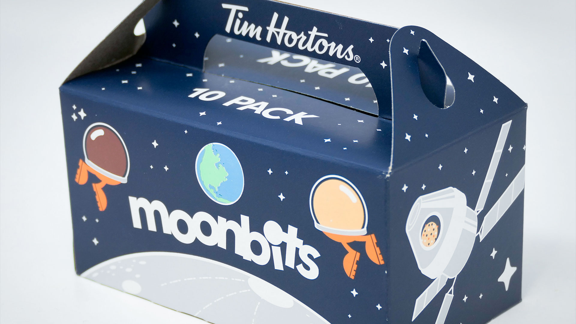 Tim Hortons' Moonbits 10-pack is decorated with illustrations of Timbits wearing Artemis pressure suits, as well as an Orion capsule, Earth and the moon. The box also includes information to excite customers about the milestone in international space exploration.