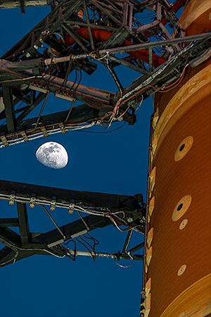The moon is seen shining over the SLS (Space Launch System) and Orion spacecraft, atop the mobile launcher, ahead of the Feb. 2 to Feb. 3 Artemis II wet dress rehearsal at NASA Kennedy Space Center's Launch Pad 39B in Florida. (NASA/Brandon Hancock)