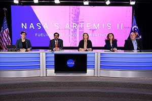 Rachel Kraft (at left), NASA public affairs; Amit Kshatriya, NASA associate administrator; Lori Glaze, acting associate administrator for exploration systems development; Charlie Blackwell-Thompson, Artemis II launch director and John Honeycutt, Artemis II mission management team chair discuss the completion of the Artemis II wet dress rehearsal at NASA's Kennedy Space Center in Florida, on Tuesday, Feb. 3, 2026. (NASA/Kim Shiflett)
