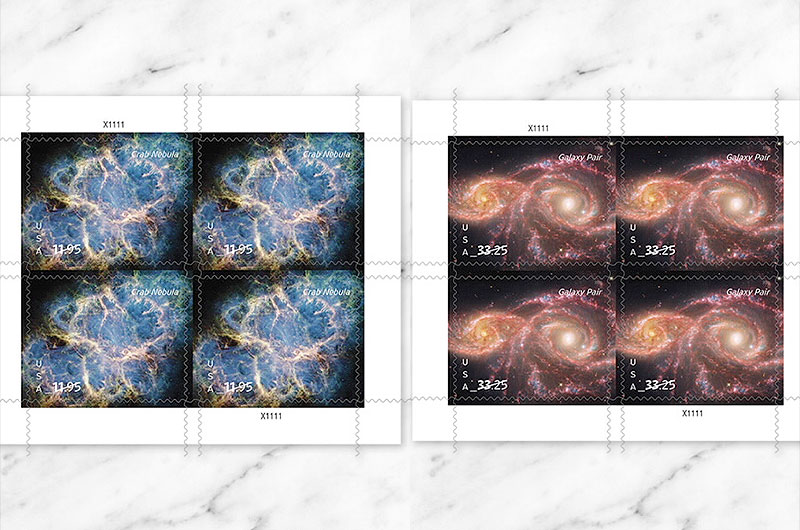 The Priority Mail "Crab Nebula" and Priority Mail Express "Galaxy Pair" stamps are each sold in panes of four. (USPS/collectSPACE) |