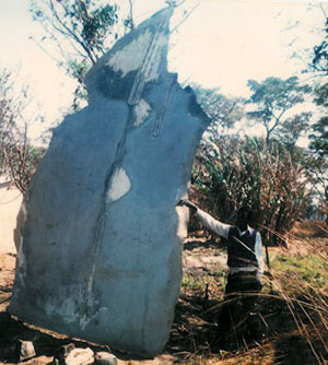 A man stands next to the piece of metal that Graham Sheppard and his son Ian first saw in 1975 while transporting missionaries to an airstrip in western Zambia. Graham took this photo of when he returned to the airstrip in 1975. (Richard Sheppard)