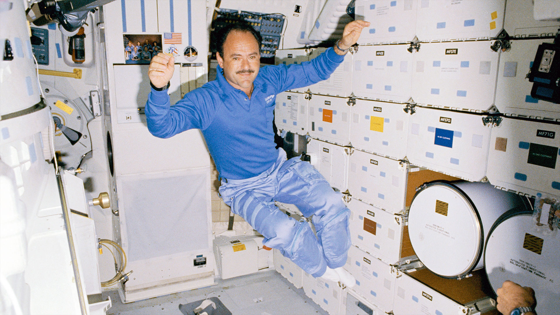 Mike Lounge on space shuttle Discovery's middeck during the STS-26 "return to flight" mission in October 1988. (NASA)