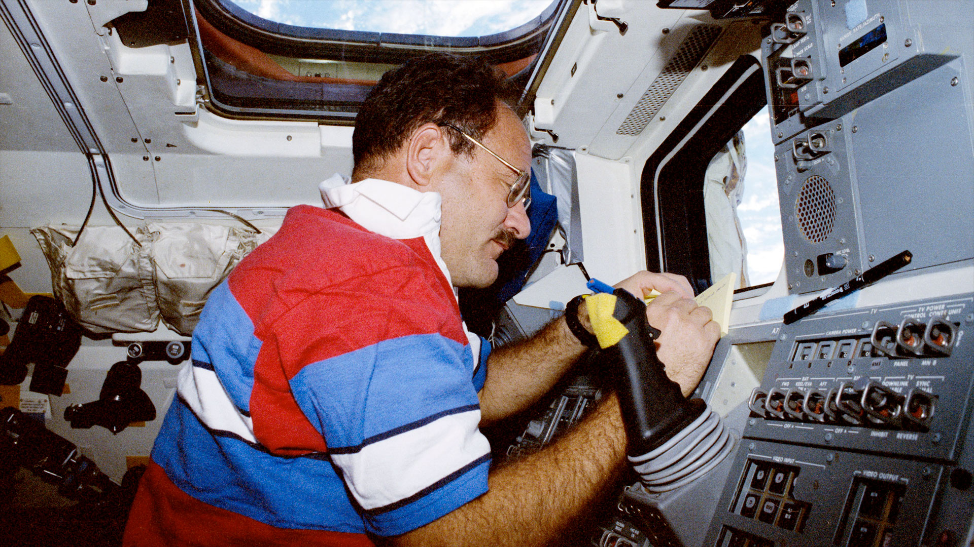 Lounge works at space shuttle Columbia's aft flight deck during the STS-35 ASTRO-1 mission in December 1990. (NASA)