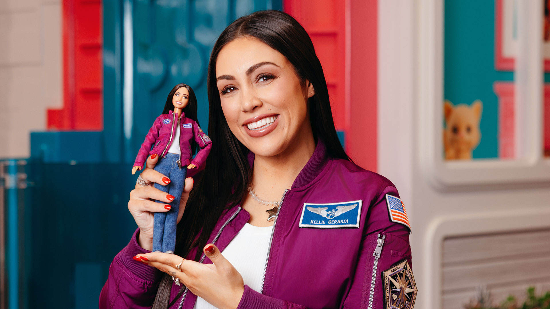 Gerardi's one-of-a-kind Barbie doll — Mattel produced it only for display rather than for sale — recreates her look and her outfit, including details like the design of her mission patches sewn to her purple jacket.