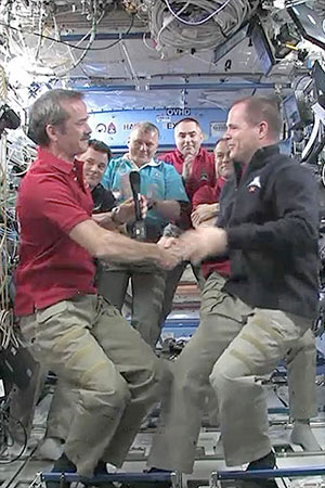 Canadian astronaut Chris Hadfield (left) accepts command of the space station from NASA astronaut Kevin Ford. (NASA TV)