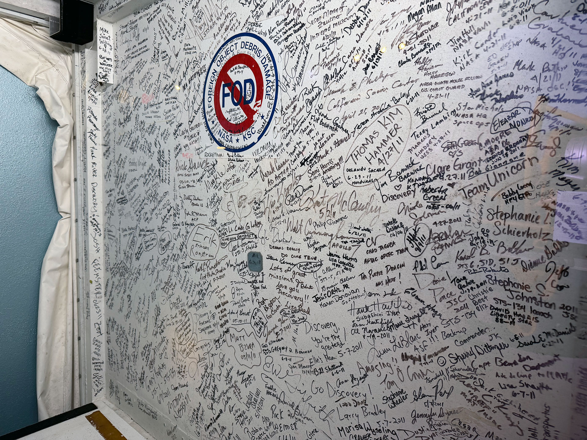 "Some of the more recognizable signatures are from the astronauts," said Clark, who signed the wall years before he became responsible for its fate. "One of the more impressive autographs is from Tom Stafford, who flew on Gemini 6, Gemini 9, Apollo 10 and the Apollo- Soyuz Test Project. Walt Cunningham from the Apollo 7 crew signed, as did Rick Hauck, who was the commander for the return to flight after the Challenger tragedy."