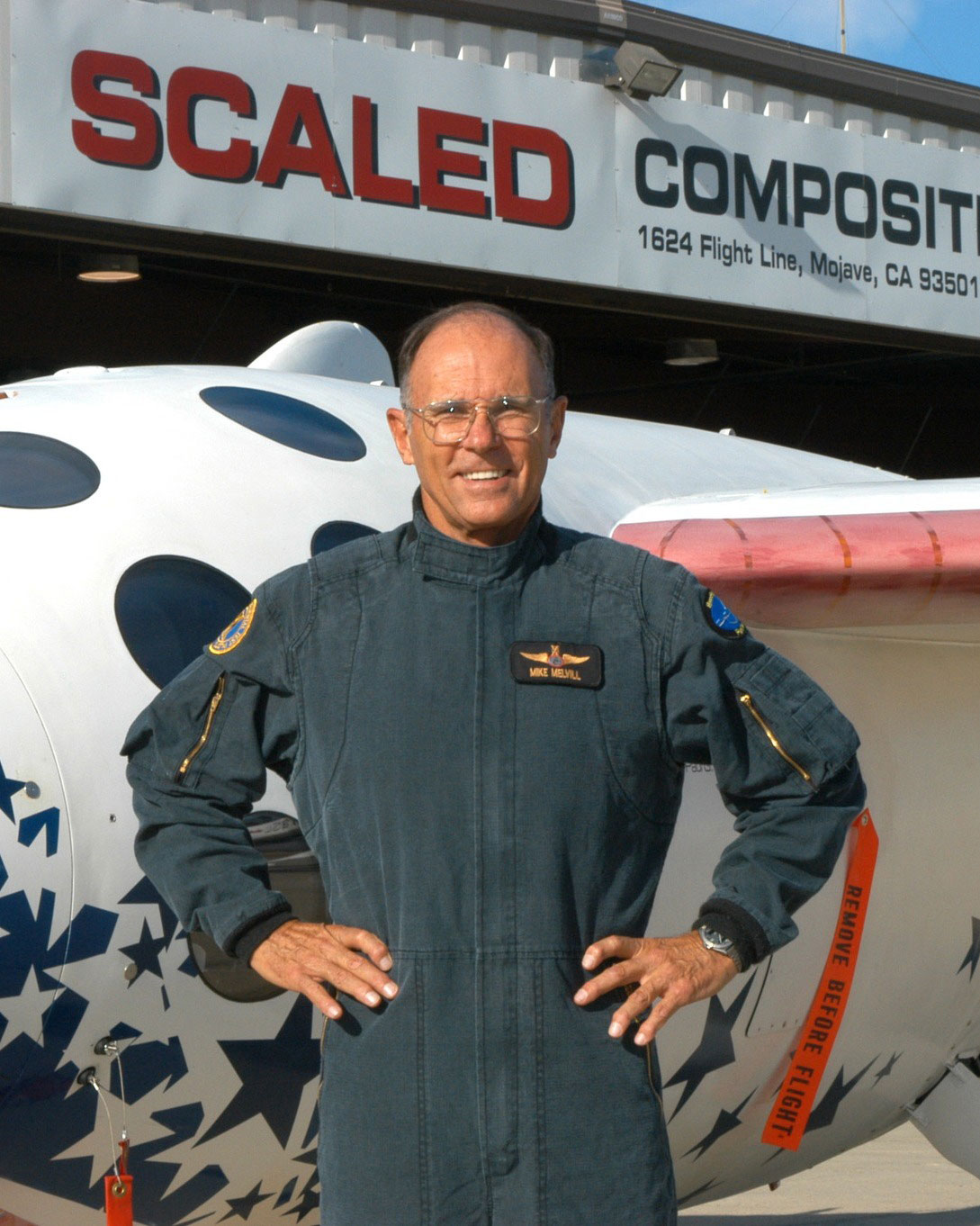 Mike Melvill poses in front of SpaceShipOne. (Scaled Composites)
