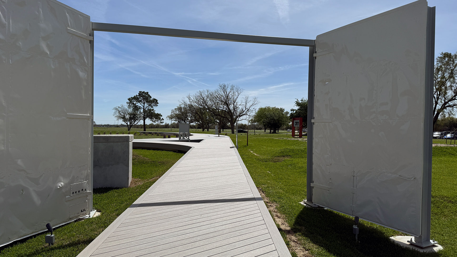 Saved from the original B37 and incorporated into the landscape of the Lunar Receiving Park are the large metal doors that led into the high bay, standing where they were when the facility still existed, and Building 37 sign that identified the building from others. The park also has interpretive displays, including flower beds laid out in a grid to represent the division between the astronauts' living quarters and others symbolizing the isolation rooms' furnishings.