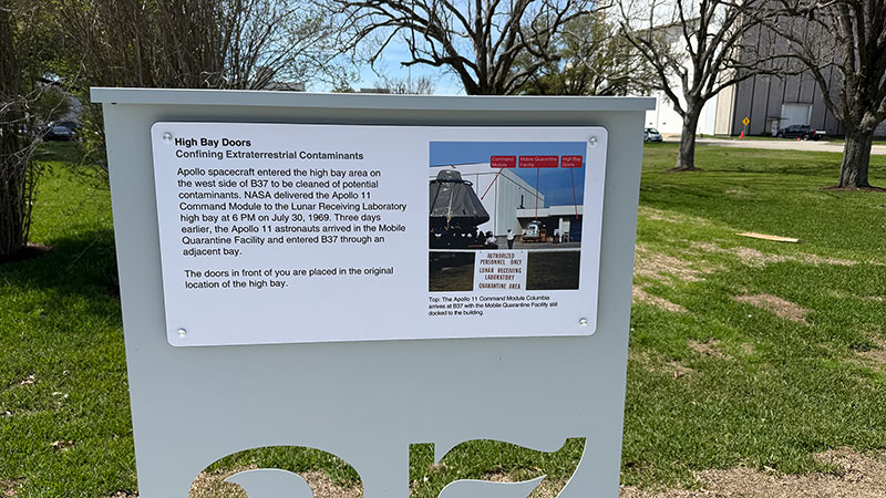 "These critical planetary protection measures commenced during the moonwalk itself and continued throughout the return journey from the moon to Earth, during the sensitive period after splashdown, on the trip from the recovery ship, and lastly to right here where JSC Building 37 (B37) once stood," the sign reads.