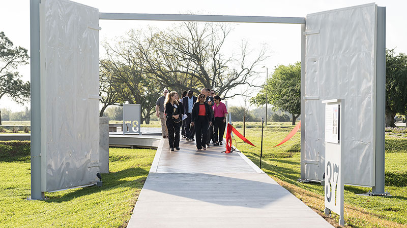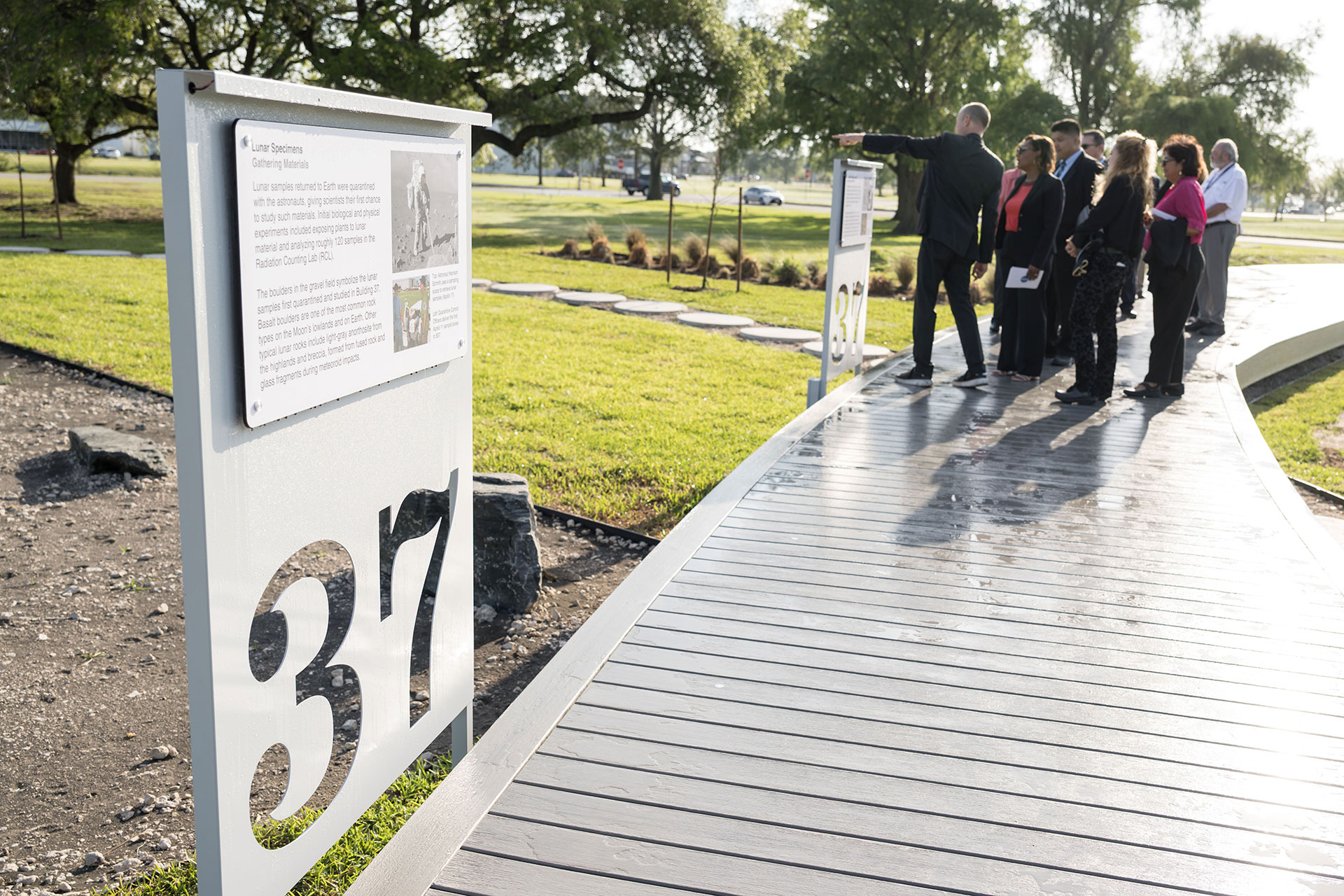 What sounds like it could be a museum tour or a walkthrough of a historic building is instead the layout of the new Lunar Receiving Park at NASA's Johnson Space Center in Houston, Texas. The interpretative outdoor space, which was created as a tribute to the history of the site, was opened on Wednesday (March 25) during a dedication ceremony.