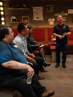 Bare Mars rock gives way to a corporate office on Mars in Season 5 of "For All Mankind." Seen here, production designer Seth Reed (sixth from right) and technical advisor Garrett Reisman (third from right) lead a press tour of the show's sets in 2024. (Apple TV)