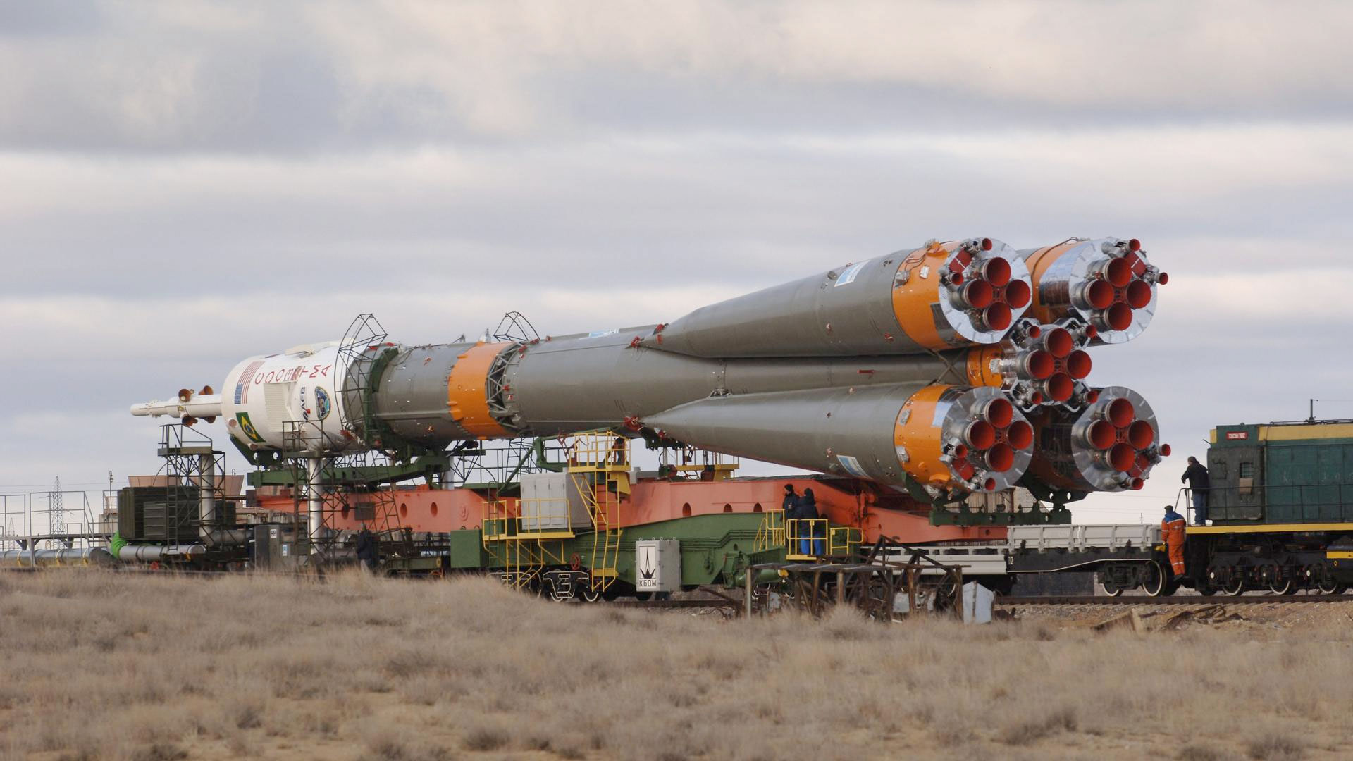 The Soyuz TMA-8 spacecraft and its booster rolled to the launch pad at the Baikonur Cosmodrome, Kazakhstan, March 28, 2006. (NASA/Bill Ingalls)