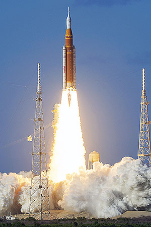 Climbing into the pre-sunset sky on a bright billowing plume, the scene evoked the long-past Apollo launches, yet the SLS resembles more closely the space shuttles that followed. Integrity's ride into Earth orbit included engines and side-mounted boosters being reused one last time from the former space transportation system.