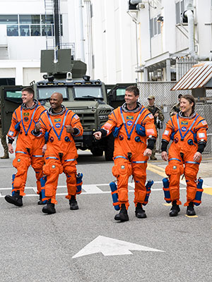 From left to right: Artemis II crew members Jeremy Hansen of the Canadian Space Agency and NASA astronauts Victor Gover, Reid Wiseman and Christina Koch board the Astrovan II for their ride to the launch pad on April 1, 2026. (NASA/Aubrey Gemignani)