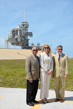 NASA Administrator Charles Bolden, SpaceX President Gwynne Shotwell, and Kennedy Space Center director Robert Cabana are seen together at Kennedy's Launch Pad 39A, which NASA leased to SpaceX for commercial use on April 14, 2014. (collectSPACE)