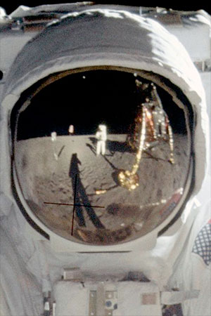 The iconic image of moonwalker Buzz Aldrin's helmet visor will serve as the design for the back of a new U.S. coin celebrating the 50th anniversary of Apollo 11, if Congress approves. (NASA)