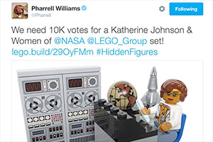 "We need 10K votes for a Katherine Johnson and Women of NASA LEGO set!" tweeted singer Pharrell Williams, who is producing and contributing music to "Hidden Figures."