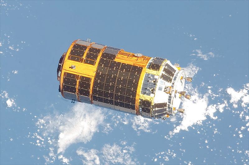 The Japan Aerospace Exploration Agency's Kounotori-2 is seen backdropped by the blue and white Earth in March 2011. (NASA)