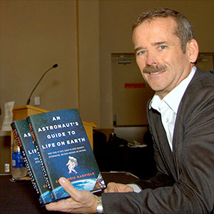 Canadian astronaut Chris Hadfield holds up copies of his book, "An Astronaut's Guide to Life on Earth." (Starport/Jami Lupold)