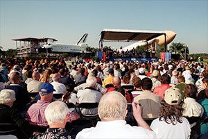 A large crowd is gathered at the Kennedy Space Center Visitor Complex to see the induction of the first space shuttle astronauts into the U.S. Astronaut Hall of Fame on Nov. 10, 2001. (NASA)