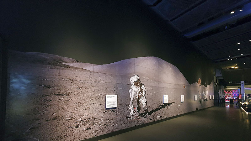 As a backdrop to the artifacts is a newly-produced wall-length mural of a scene from Apollo 17 showing Harrison Schmitt kneeling while setting up a science experiment, as well as the Apollo lunar roving vehicle and the lunar module in the distance. The 1972 photo was processed for the 2022 book, "Apollo Remastered" by Andy Saunders and may be the largest photograph of the moon on Earth.