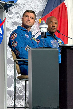 Artemis II commander Reid Wiseman (left) with a model of his and his crew's Orion spacecraft, which he announced has been named "Integrity" during a press conference at NASA's Johnson Space Center in Houston on Wednesday, Sept. 24, 2025. (collectSPACE)