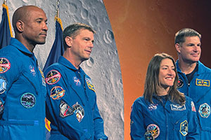 The Artemis II crew (from the right): Reid Wiseman, Victor Glover, Christina Koch and Jeremy Hansen pose in front of their Orion spacecraft, which they have named "Integrity." (NASA/Rad Sinyak)