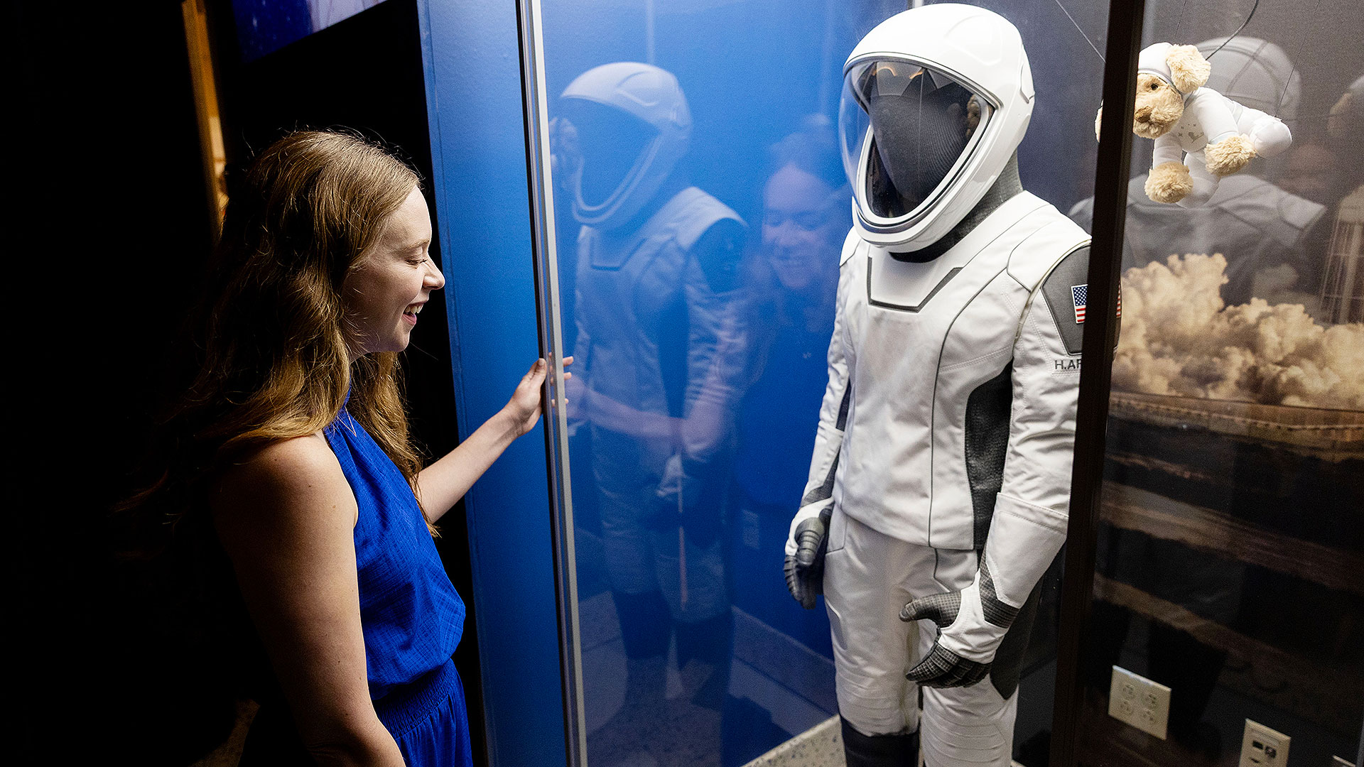 Pediatric cancer survivor and physician's assistant Hayley Arceneaux views her Inspiration4 pressure suit and zero-g indicator hours before they went on display at St. Jude Children's Research Hospital in Memphis, Tennessee on Tuesday, Oct. 7, 2025. (St Jude/ALSAC) |