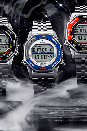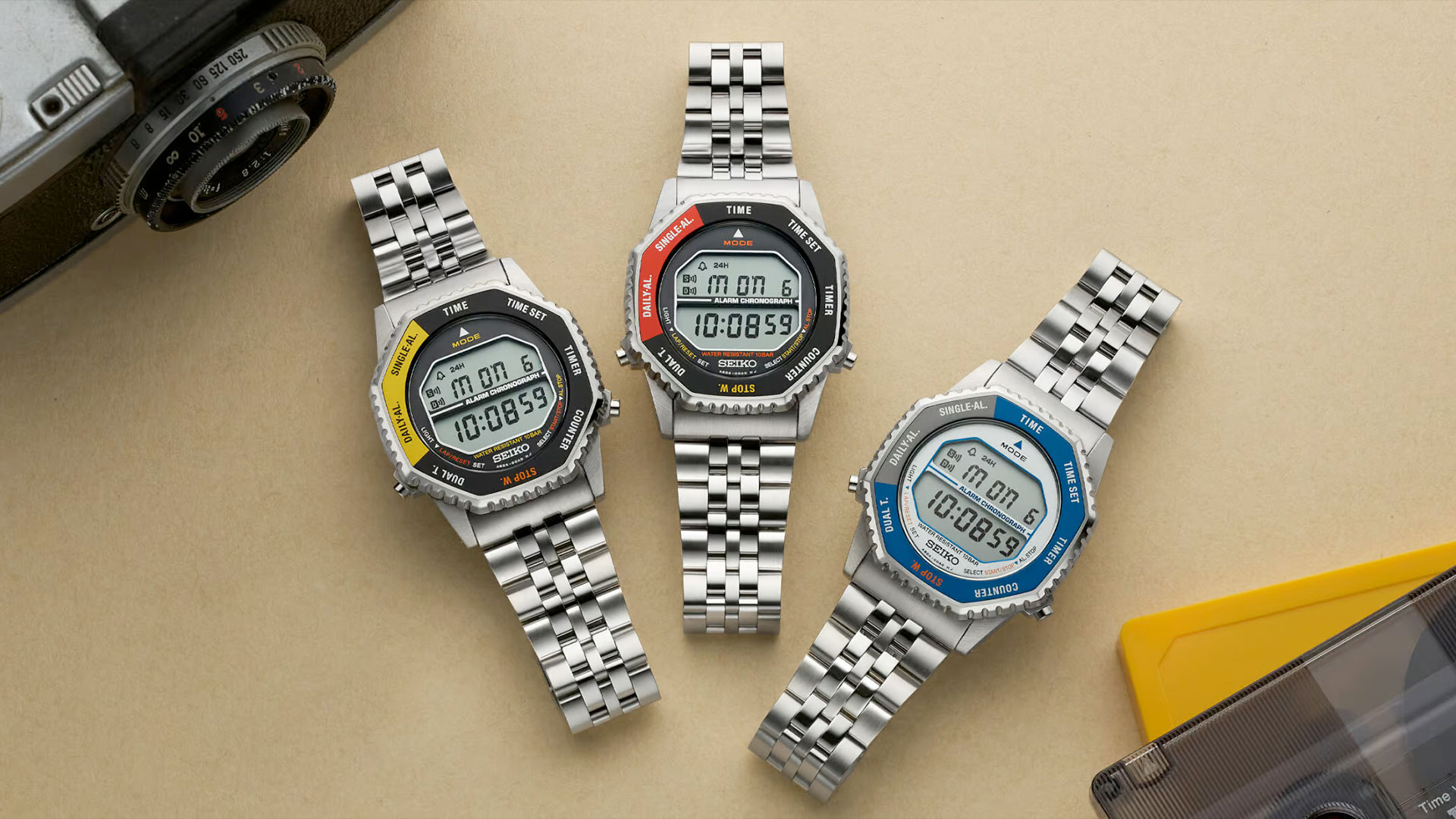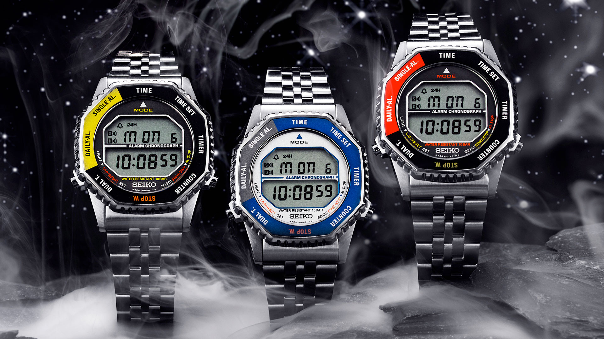 Seiko's new digital watches were inspired by the 1982 A829 Sports 100 "Rotocall" models and feature the same distinct turning bezel control. (Seiko) |