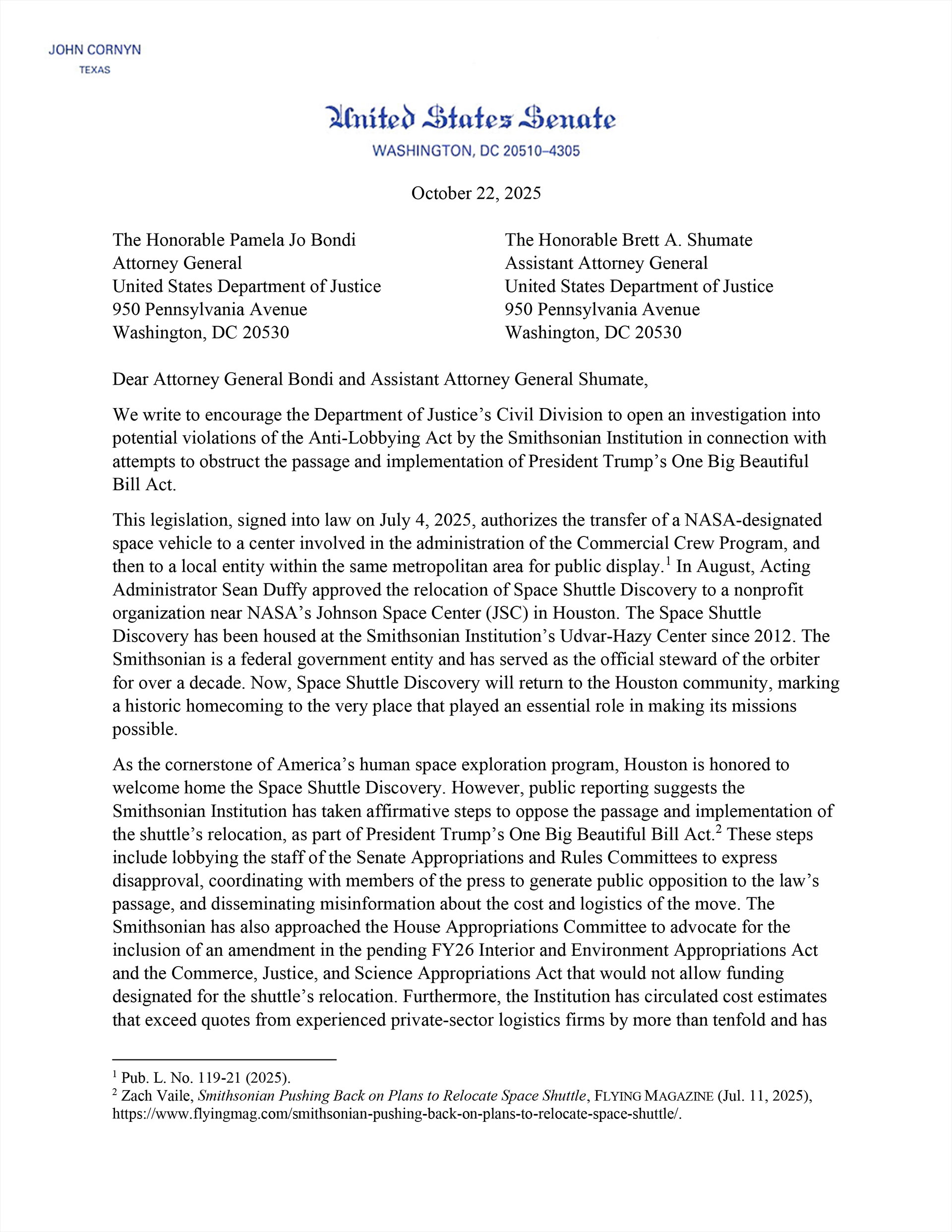 "Public reporting suggests the Smithsonian Institution has taken affirmative steps to oppose the passage and implementation of the shuttle's relocation, as part of President Trump's One Big Beautiful Bill Act," wrote Cornyn and Cruz to Attorney General Pamela Jo Bondi and Assistant Attorney General Brett Shumate. "These steps include lobbying the staff of the Senate Appropriations and Rules Committees to express disapproval, coordinating with members of the press to generate public opposition to the law's passage and disseminating misinformation about the cost and logistics of the move."