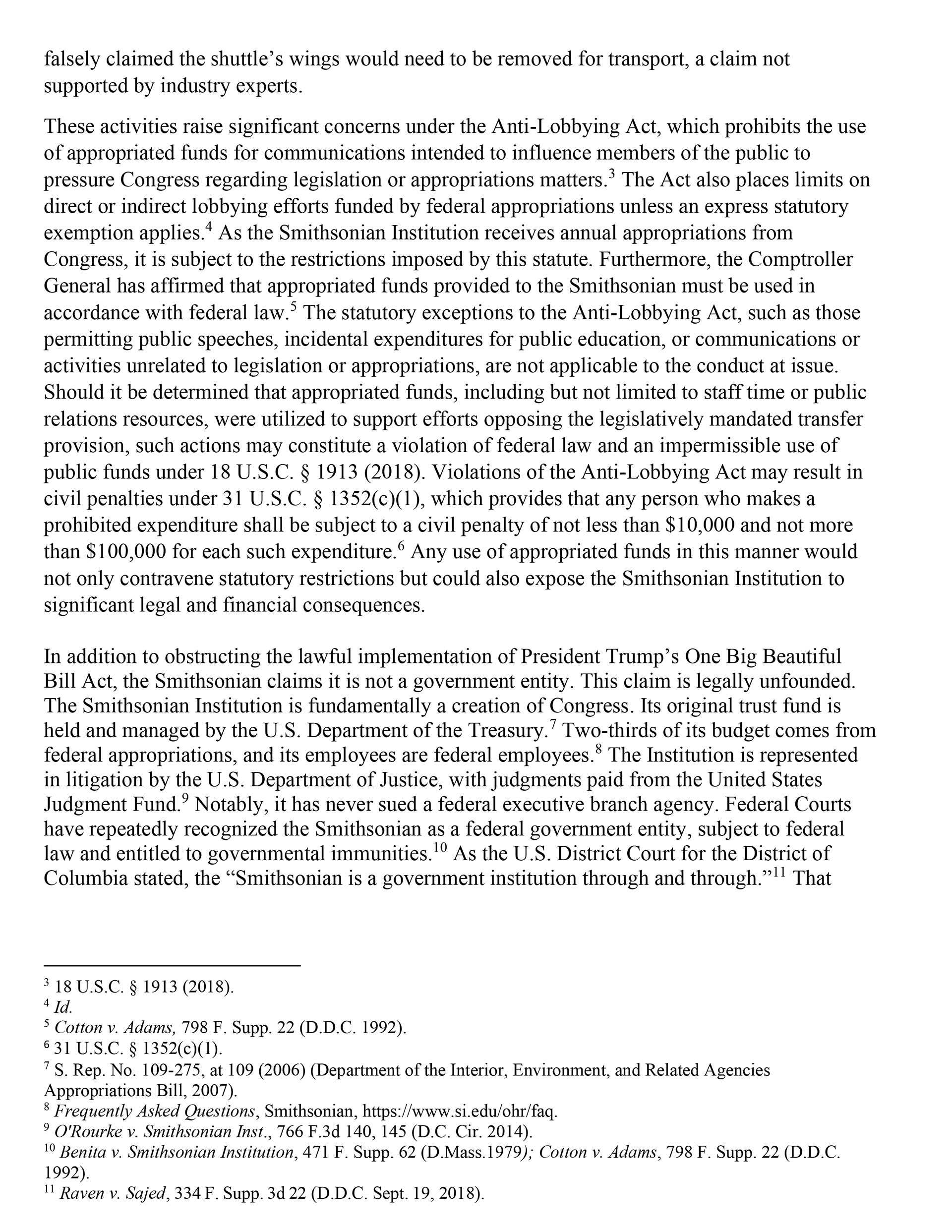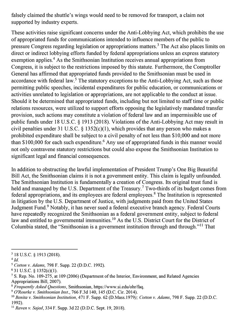The letter also alleged that the Smithsonian has called for the pending fiscal year 2026 Interior and Environment Appropriations Act and the Commerce, Justice, and Science Appropriations Act to be amended such that it blocks funding for the shuttle's transport and rehousing.