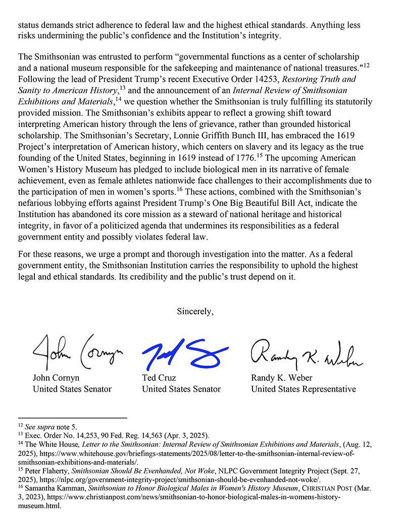 The appeal to the DOJ advances similar concerns that Cornyn first raised in a August letter to Chief Justice of the United States John Roberts in his role as chancellor of the Smithsonian. In that correspondence, also co-authored by Weber, Cornyn urged that Roberts "conduct a comprehensive internal review" for any violations of the Anti-Lobbying Act and "immediate and appropriate corrective measures be implemented" if found.