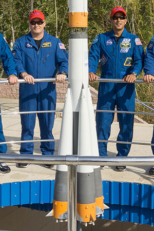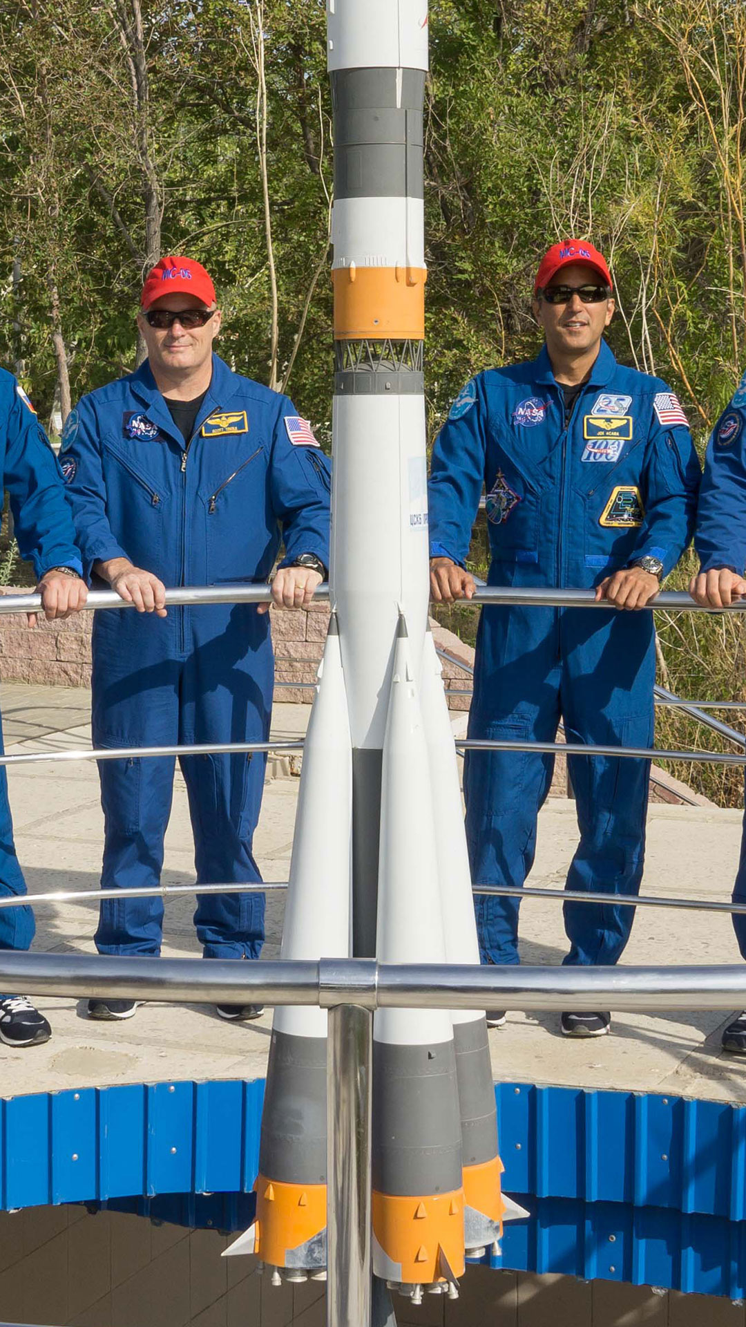Scott Tingle (at left) and Joe Acaba, both future chiefs of NASA's astronaut office, pose with a Soyuz model outside of the crew quarters in Baikonur, Kazakhstan in 2017. (NASA/Victor Zelentsov)