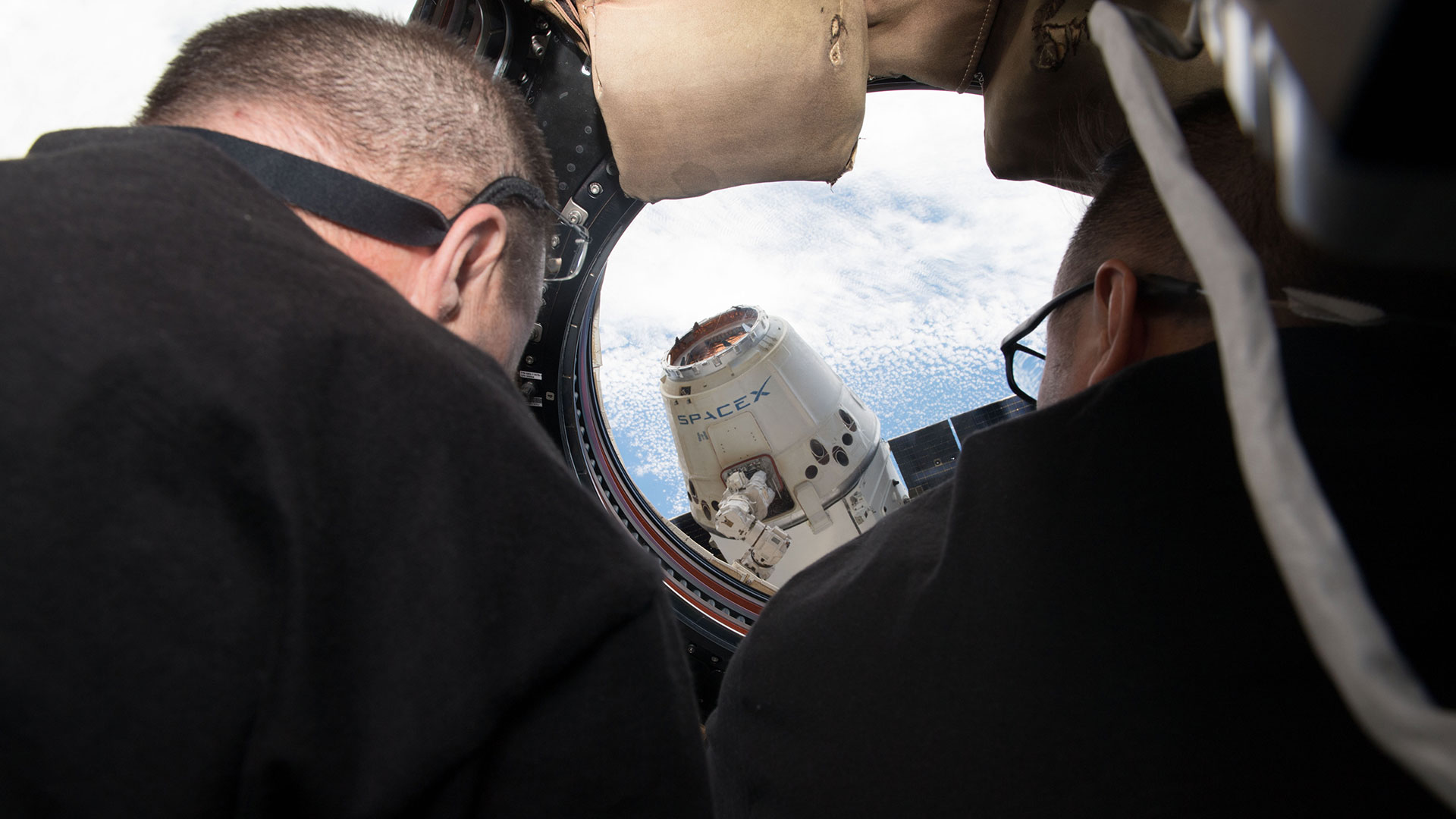 Seen from behind, future successive NASA chief astronauts Scott Tingle (left) and Joe Acaba monitor a SpaceX Dragon cargo spacecraft from inside the International Space Station's windowed cupola during Expedition 44 in January 2018. (NASA)