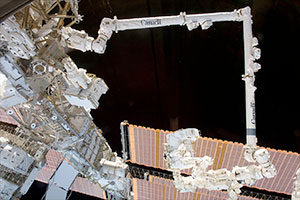 "Dextre," the Canadian Space Agency's dexterous manipulator, is seen attached to the Canadarm2 on the space station. (NASA)