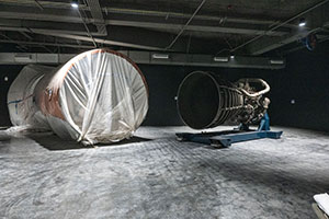 A walkthrough solid rocket booster segment and a space shuttle main engine were the first artifacts installed in the "Rocket Science" section of the new Kent Kresa Space Gallery in the Samuel Oschin Air and Space Center. (California Science Center)