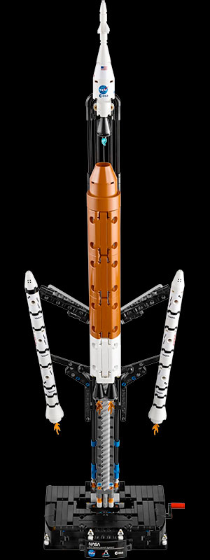 The LEGO Technic NASA Artemis Space Launch System Rocket set reproduces in motion the major milestones of the moon-bound vehicle's climb into Earth orbit on its way to flying astronauts to the moon. (LEGO/collectSPACE) |