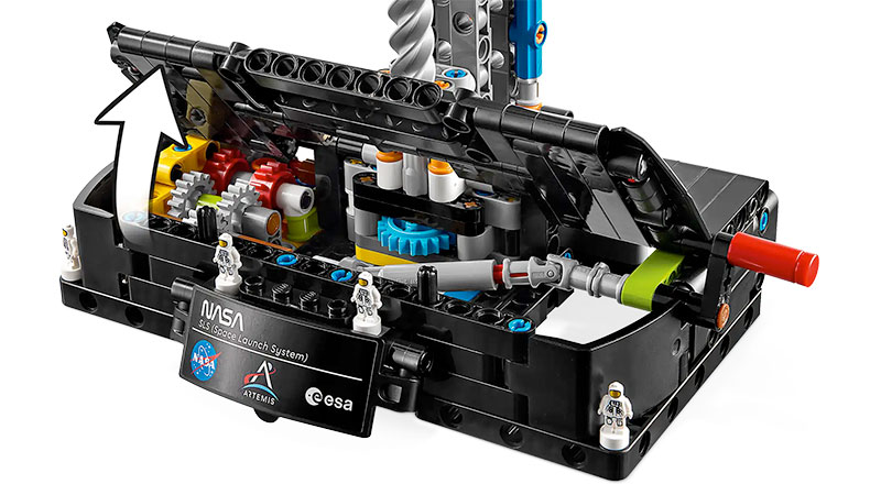 The lid of the mobile launcher opens to reveal the gears that set the LEGO Technic NASA Artemis Space Launch System Rocket into motion. (LEGO) |