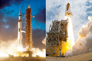 First and last launches, for now: The Apollo 4 Saturn V liftoff (left) and STS-135 space shuttle launch were the first and last to leave Launch Pad 39A in 1967 and 2011, respectively. (NASA) |