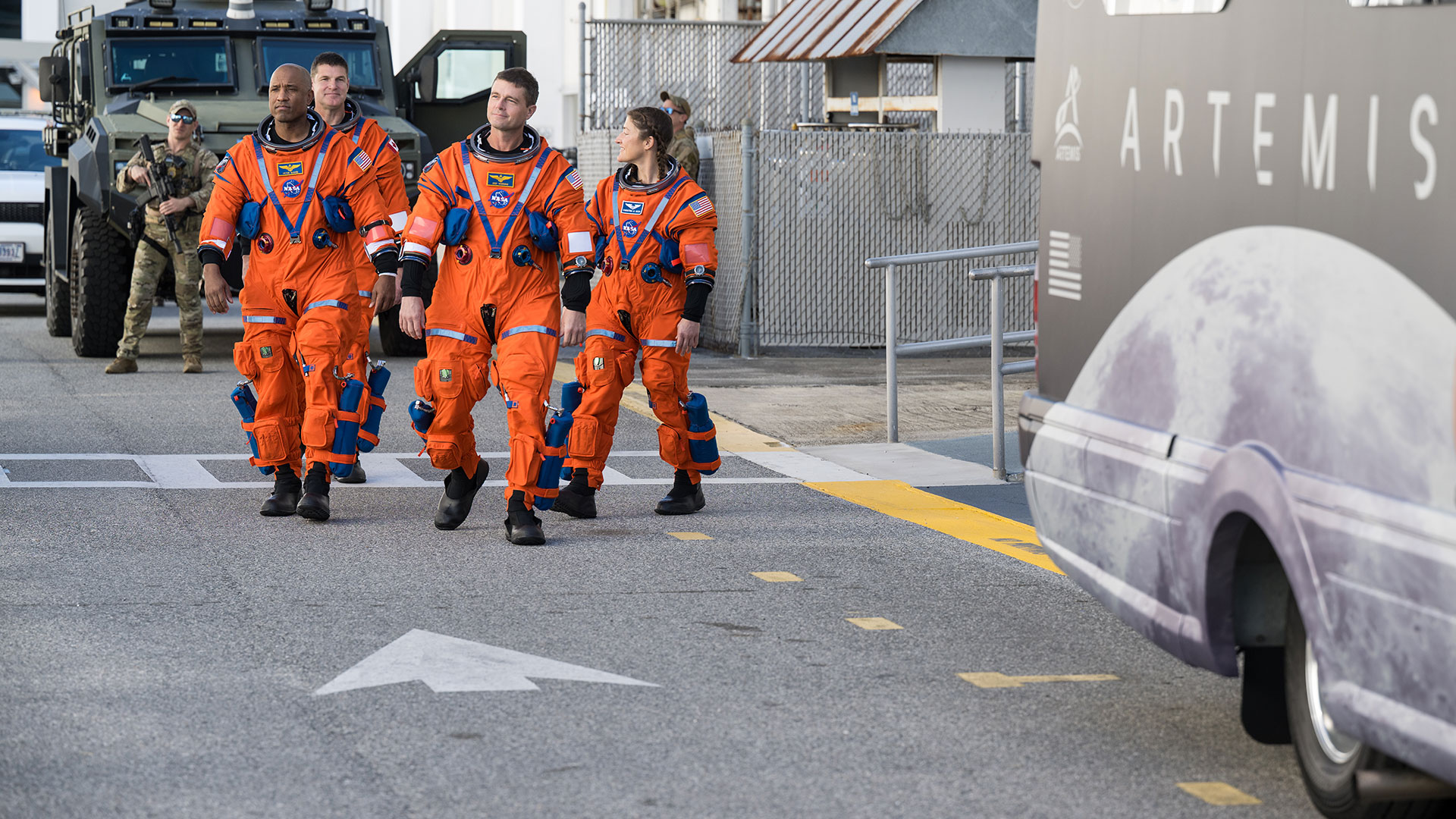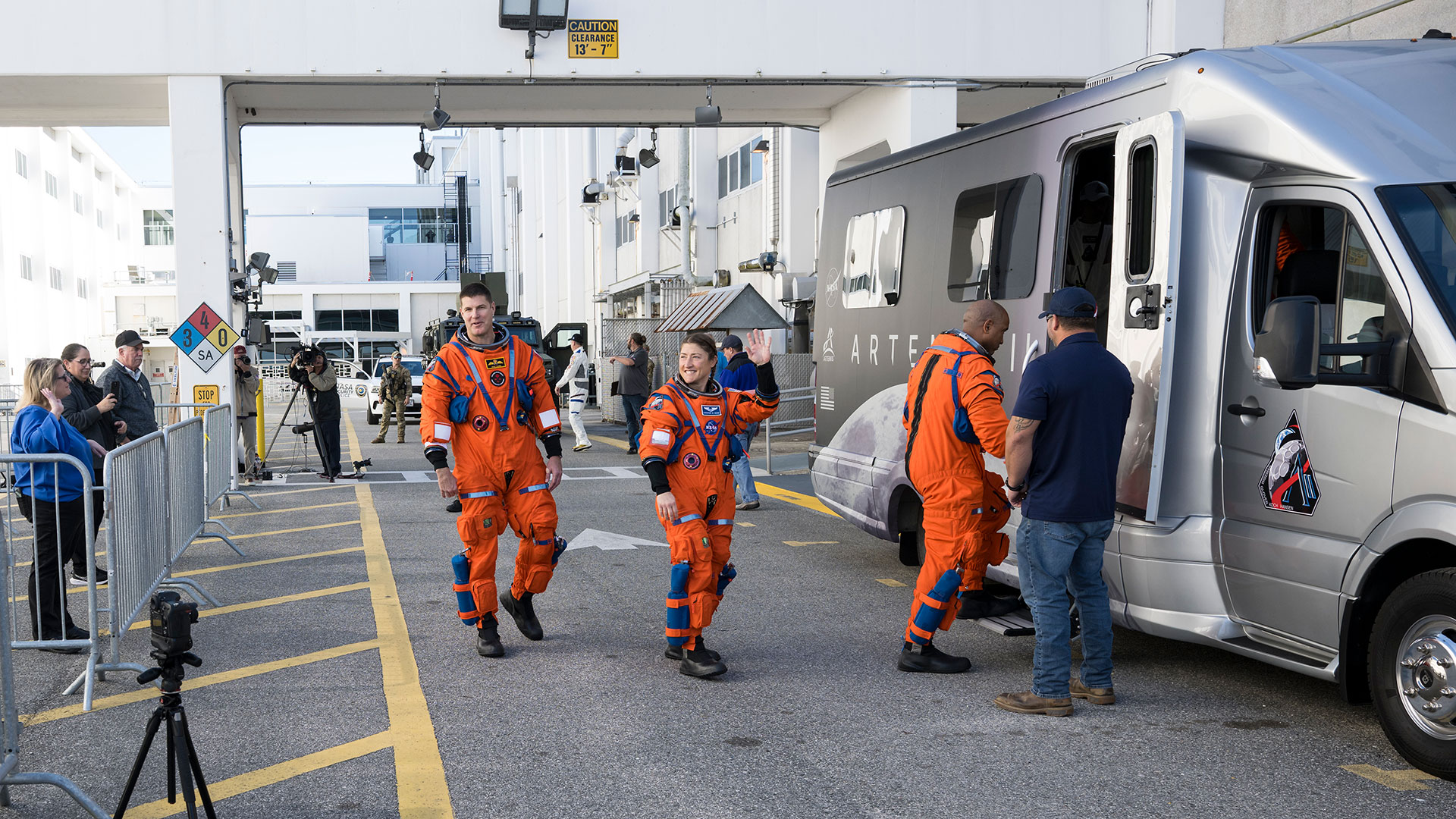 The Artemis II crew (from left to right) of Victor Glover, Jeremy Hansen, Reid Wiseman and Christina Koch exit the Neil A. Armstrong Operations and Checkout Building at NASA's Kennedy Space Center in Florida for the waiting Astrovan II transport vehicle. (NASA/Aubrey Gemignani)
